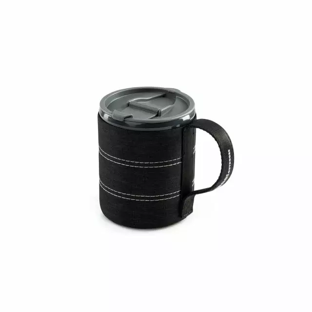 Keep your beverage warm on the trail or during a long commute with the Infinity Backpacker Mug. Our favorite mug, now in the GSI Eco line, leads the way when it comes to materials and manufacturing. Made from BPA-free, non-leaching polypropylene and wrapped in a recycled plastic (rPET) cloth. The insulated sleeve, non-slip footing, and sealable sip through lid keep the contents warm (or cold) and free from spills, trail dust, and critters. A sturdy webbing handle gives a great grip and collapses flush for compact storage in your pack. The Infinity Mug with graduations for easy measurement holds 17.5 fluid ounces but weighs just 3.5 ounces, making it light enough for even the choosiest, ounce-shaving through-hiker.