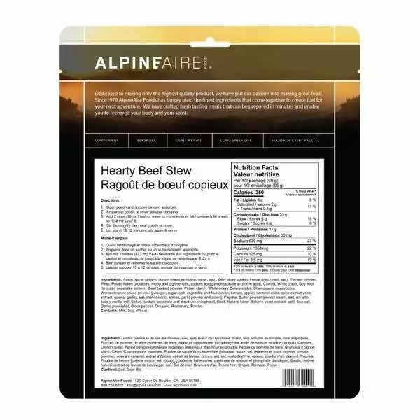 Ingredients: pasta, spiral (ground durum wheat semolina, water, salt), beef diced cooked freeze dried (beef, salt), tomato powder, peas, potato flakes (potatoes, mono and diglycerides, sodium acid pyrophosphate and citric acid), carrots, white onion, soy flour (textured vegetable protein), beef cooked powder, potato starch, white onion, celery stalks, champignon mushrooms, worcestershire sauce powder {[vinegar, sugar, salt, vegetable and fruit (onion, tomato, apple), caramel color, spice extract yeast extract, spices, garlic], salt, maltodextrin, spices, garlic powder and onion}, paprika, butter powder [(sweet cream, salt, annatto color), nonfat milk solids, sodium caseinate and disodium phosphate], basil, natural flavor (baker’s yeast extract, salt), sea salt, garlic granulated, black pepper, oregano, rosemary, parsley.
