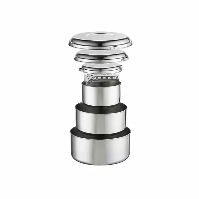 - Includes: (1) 1L pot, (1) 2L pot, (1) 3L pot, (3) lids/plates, (1) PanHandler™ pot handle, and stuff sack.