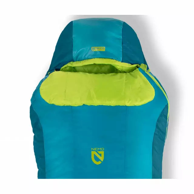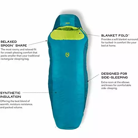 The NEMO Tempo Men’s synthetic sleeping bag blends roomy comfort with NEMO’s popular Spoon shape for a relaxed, crowd-pleasing fit that packs smaller than a rectangular sleeping bag. With a generous cut at the elbows and knees, side sleepers can shift positions comfortably throughout the night.